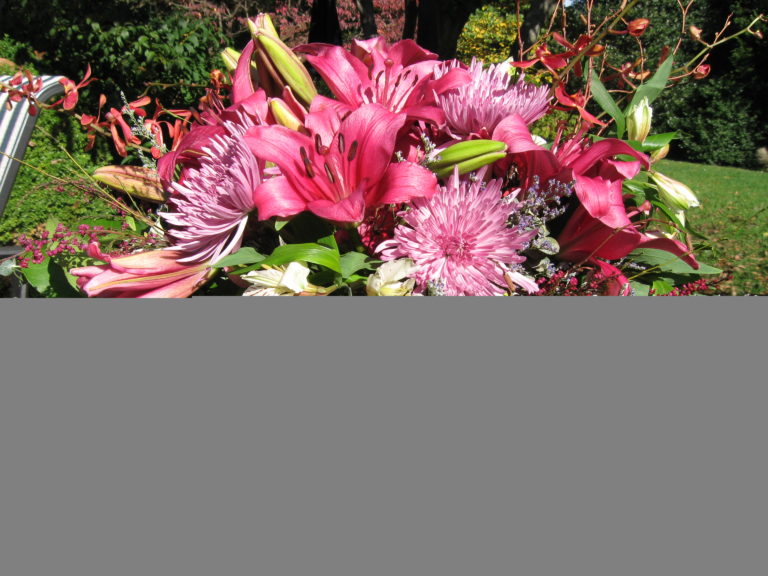 A riot of colors. Lavender stock as a high centerpoint that sways to the right, yellow roses marching along one side and mums with matching alstromeria blending into a patch of purple on the other side. The oasis sits high , about 2 inches above the rim of the vase and the flowers are kept […]