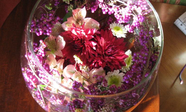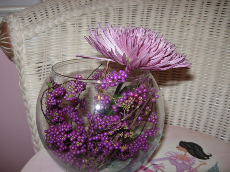 Here’s a take on a snow globe with beauty berries and some alstromeria, mini and medium size mums. There’s a little strawflower if you look closely.