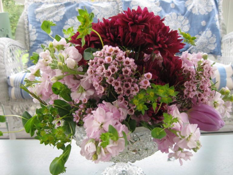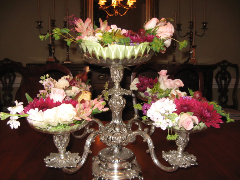 There’s an accent aigue somewhere hidden, on top of this beautiful masterpiece of silver that is every floral designer’s dream. Cabbage underneath, miniature burnt brown bananas, grapes, roses, mums, stock, the list goes on. Enjoy!