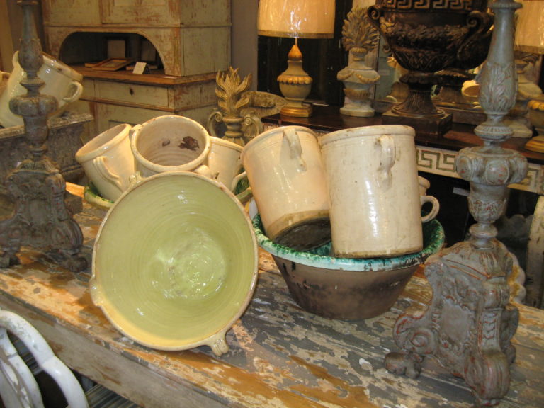 Italian sardine crocks and Provencal mixing bowls drew me and a small crowd to the booth of The Elephant’s Ear at the Baltimore Antique Show this weekend. John Grafe, the dealer from Jackson, MS imports these wonderful crockery that makes you think doubly of cooking and gardening.