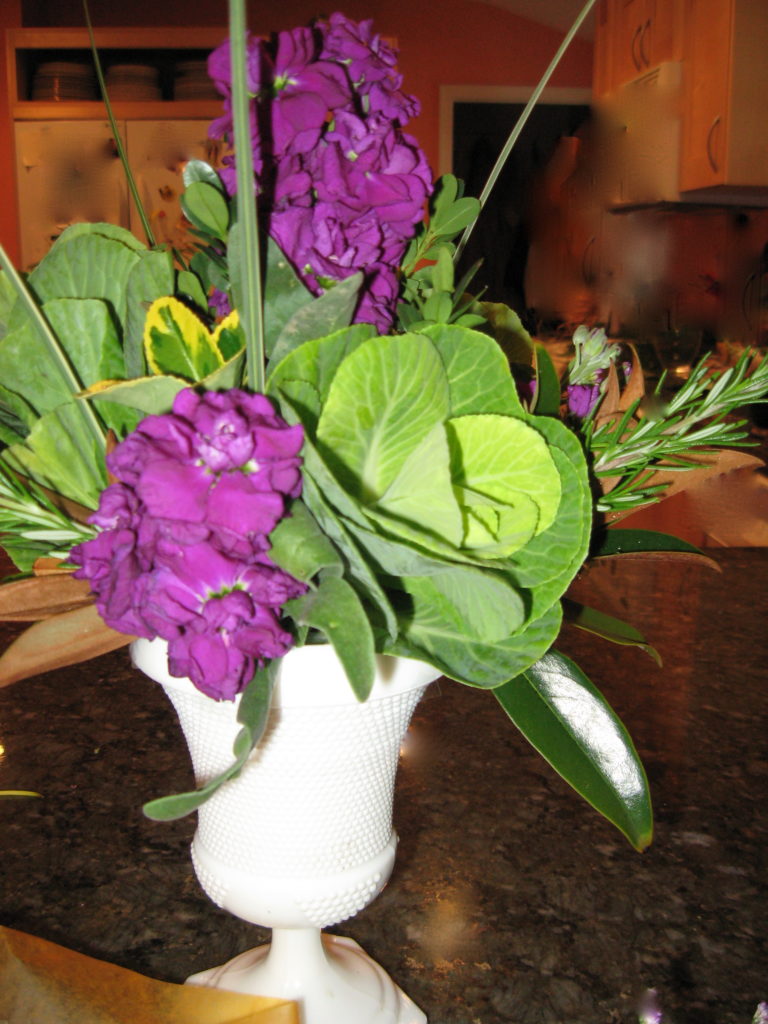 Green cabbage soup with purple stock. A nice little statement for the foyer or four seater table. Watch for more ornamental cabbage soup recipes.