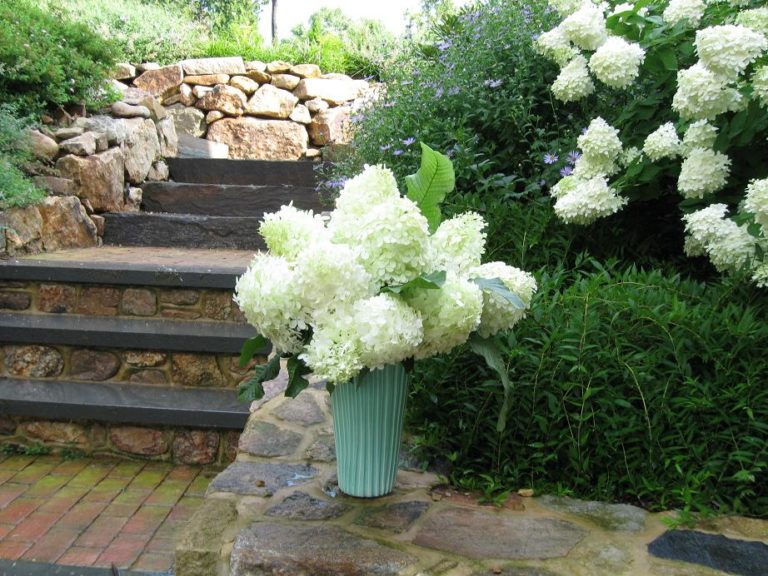 What a vase – doesn’t it speak to you of summer? No need to add any other color but white to this Fern Hill vase. The blooms are peegee hydrangeas cut from the morning light before the afternoon sunshine. Crocodile ferns with their spiny underside adds a neat texture. You can see where we cut the flowers […]