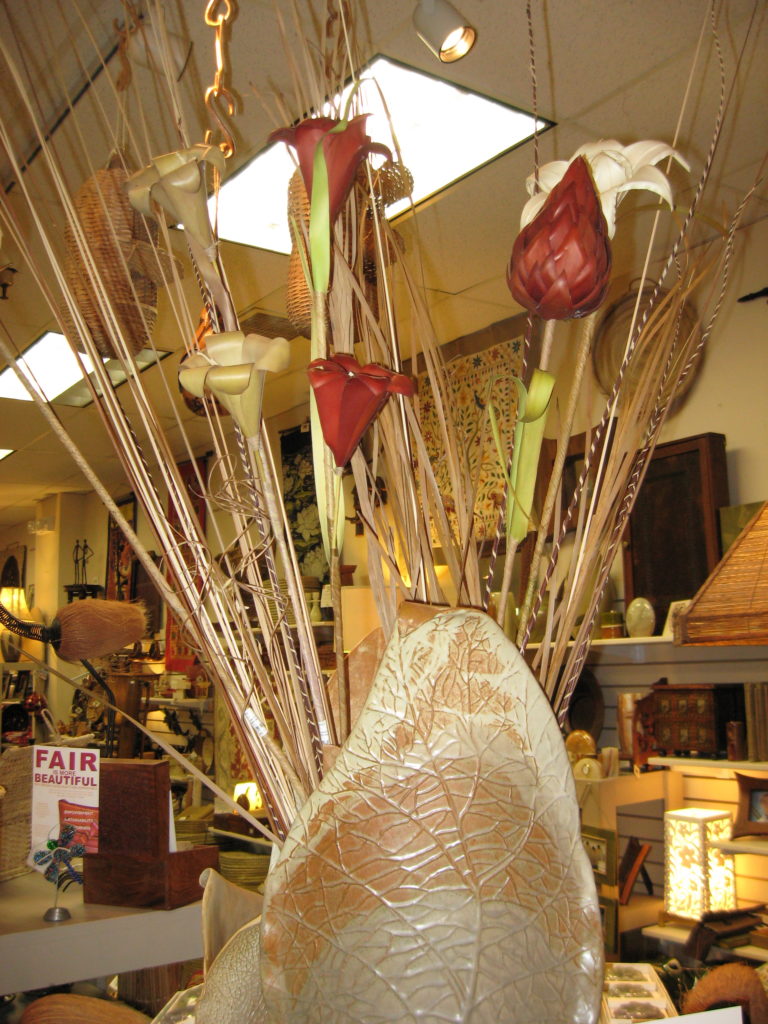 How whimsical these paper flowers are like a giraffe’s head above the grasses. The Indonesian vase is large in scale, perfect for a lobby or pediatric practice foyer. Of course we can’t limit this arrangement to that. It’s got staying power, certainly an investment that pays dividends. Hint: One village makes an arrangement.