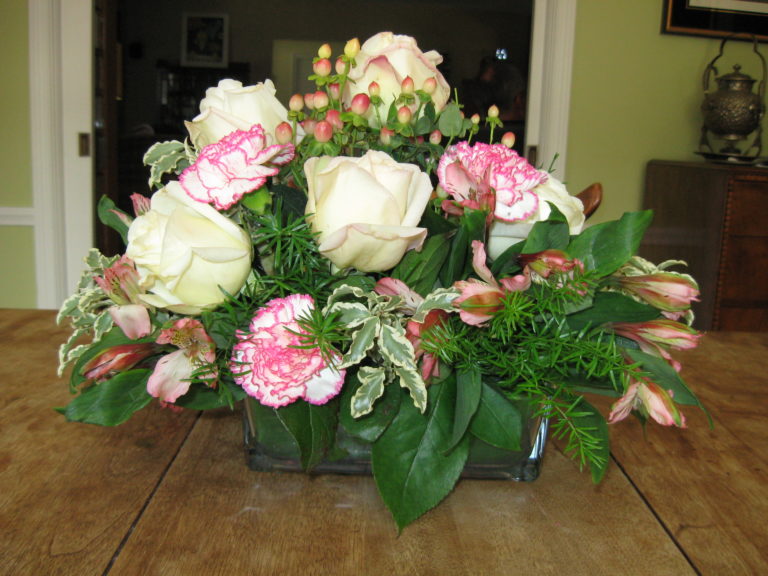 The ingredients for this recipe call for four greens, a wide leaf to cover the oasis in the vase, salal leaves, asparagus ferns, and variegated pittosporum. We had about 7 fully opened “Virginia” roses, pink tinged white carnations, and hypericum berries. The arrangement is skirted with pink and white alstromeria which help hide the top […]